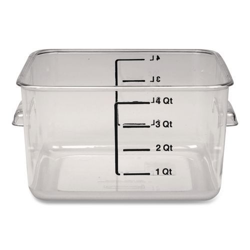 The Rubbermaid Commercial Carb-X Space Saving Food Storage Container features graduated measurements on the side to make it easy to measure contents. The square shape saves space while the break-resistant polycarbonate provides durability and strength.